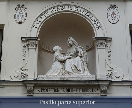 LA CORONA (Parte superior derecha de la imagen): En 1897, en respuesta a la petición del Padre Fiat, Superior General de la Congregación de la Misión y de las Hijas de la Caridad, el Papa León XIII concede la autorización para coronar "la estatua de la Inmaculada Concepción, LLAMADA DE LA MEDALLA MILAGROSA". La corona, regalada por algunas personas piadosas y por las Hijas de la Caridad, fue realizada por Mellerio. La solemnidad de la coronación tuvo lugar el 26 de julio de 1897.
