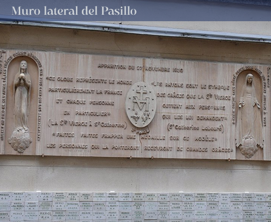 Donde está actualmente la estatua de San José, se encontraba un cuadro de Santa Ana. Debajo de este cuadro, la noche del 18 al 19 de julio de 1830, se apareció la Santísima Virgen sentada en un sillón que está colocado actualmente en la capilla lateral derecha dedicada a San Vicente. En esta capilla hay un altar de mármol, adornado con piedras preciosas. Procede, como el tabernáculo del altar mayor, de la calle de Vieux Colombier. De 1815 a 1856, fue el altar mayor de la capilla. Este altar es el que la Santísima Virgen designó con la mano a Santa Catalina en la primera aparición, cuando le dijo: "Venid al pie de este altar. Aquí las gracias serán derramadas sobre todas las personas que las pidan con confianza y fervor".