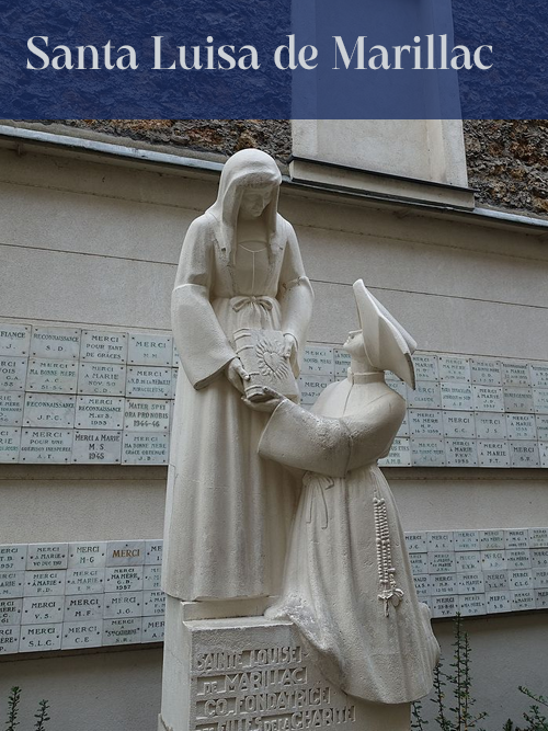 Cofundadora de las Hijas de la Caridad, Santa Luisa de Marillac fue, primero esposa y madre. Al quedarse viuda, el encuentro con San Vicente fue determinante en su vida. Fue Dama de la Caridad y después reunió algunas jóvenes del campo, deseosas de entregarse a Dios para el servicio de los pobres. Con San Vicente, Luisa estableció una Compañía de un estilo nuevo, enteramente dedicada al servicio de los pobres y de los enfermos. Dos días antes de su muerte, dejó a las Hermanas su testamento espiritual: "Tengan gran cuidado del servicio de los pobres y sobre todo de vivir juntas en una gran unión y cordialidad, amándose las unas a las otras, para imitar la unión, y la vida de Nuestro Señor. Pidan mucho a la Santísima Virgen que sea Ella su única Madre". Santa Luisa muere el 15 de marzo de 1660, unos meses antes que San Vicente.