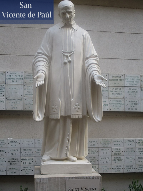 Genio de la caridad, San Vicente de Paúl socorrió, "material y espiritualmente", a los pobres, los enfermos, los presos, los niños abandonados, los ancianos, las víctimas de la guerra. Para el servicio de los más desfavorecidos, fundó en 1617 las Cofradías de las Damas de la Caridad (en Francia, los Equipos de San Vicente), en 1625 los Sacerdotes de la Misión (Lazaristas) y en 1633, con Santa Luisa de Marillac, fundó las Hijas de la Caridad. A su inmensa obra en favor de los pobres, se une su acción incansable de evangelización del campo y la formación del clero. Su corazón adquiere las dimensiones del mundo: en 1648, algunos misioneros parten a Madagascar y, en 1652, Sacerdotes de la Misión e Hijas de la Caridad llegan a Polonia. El 27 de septiembre de 1660, San Vicente muere repitiendo estas palabras que fueron el secreto de su vida: "¡Creo!" "¡Confio!". El 25 de abril de 1830, tiene lugar la traslación de las reliquias del que París llama "Padre de los Pobres". En el cortejo solemne que lleva de la Catedral de París, "Notre Dame", a la capilla de San Vicente, en la calle de Sévres, 95, se encuentra una joven novicia borgoñona que ha descubierto su vocación a través de una llamada del gran santo: Catalina Labouré.