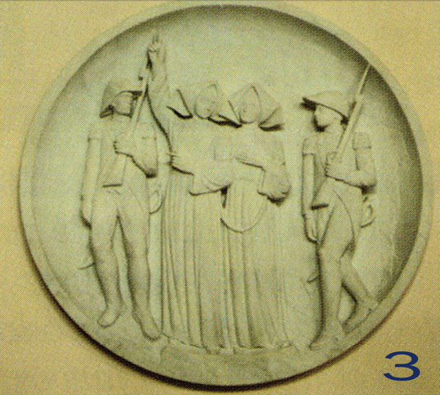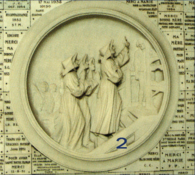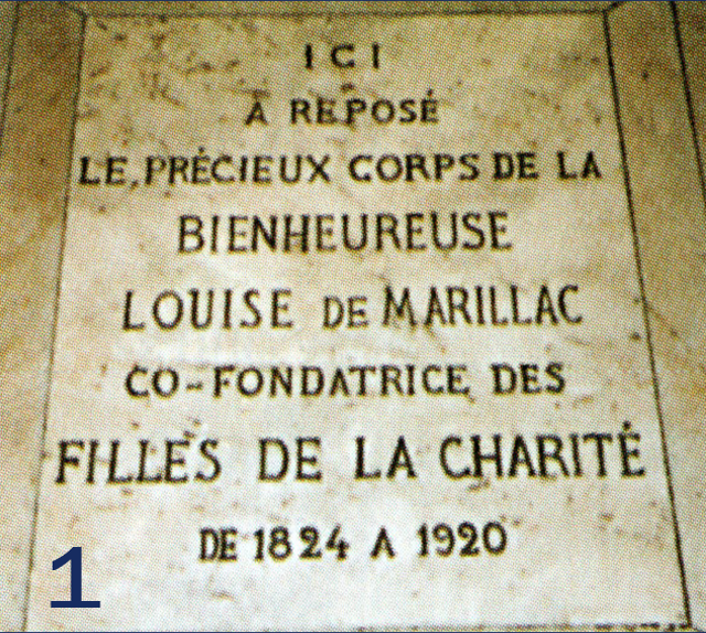En el pasillo central, una lápida de mármol cubre la sepultura donde se colocaron las reliquias de la fundadora en 1824 (imagen 1). Desde 1920, año de su beatificación, están expuestas en una urna, a la izquierda del presbiterio. A ambos lados del presbiterio, dos medallones de piedra recuerdan la fecha de 1792, tiempo de mártires. Todas las Congregaciones fueron disueltas en Francia. Las Hijas de la Caridad tuvieron que dejar su casa del barrio de Saint Denis, donde vivían desde 1641. Poco a poco, la Compañía va resurgiendo y después de unos años en la calle de Vieux Colombier, se instala en la calle del Bac, en la que será su casa madre. En la imagen 2, se puede apreciar a cuatro Hermanas de Arras subiendo al cadalso para ser guillotinadas. Ellas fueron beatificadas en 1920. En la imagen 3, dos Hermanas van a ser fusiladas en Angers. Ellas fueron beatificadas en 1984. Todas, por haberse negado a prestar el juramento revolucionario que las separaba de la Iglesia.